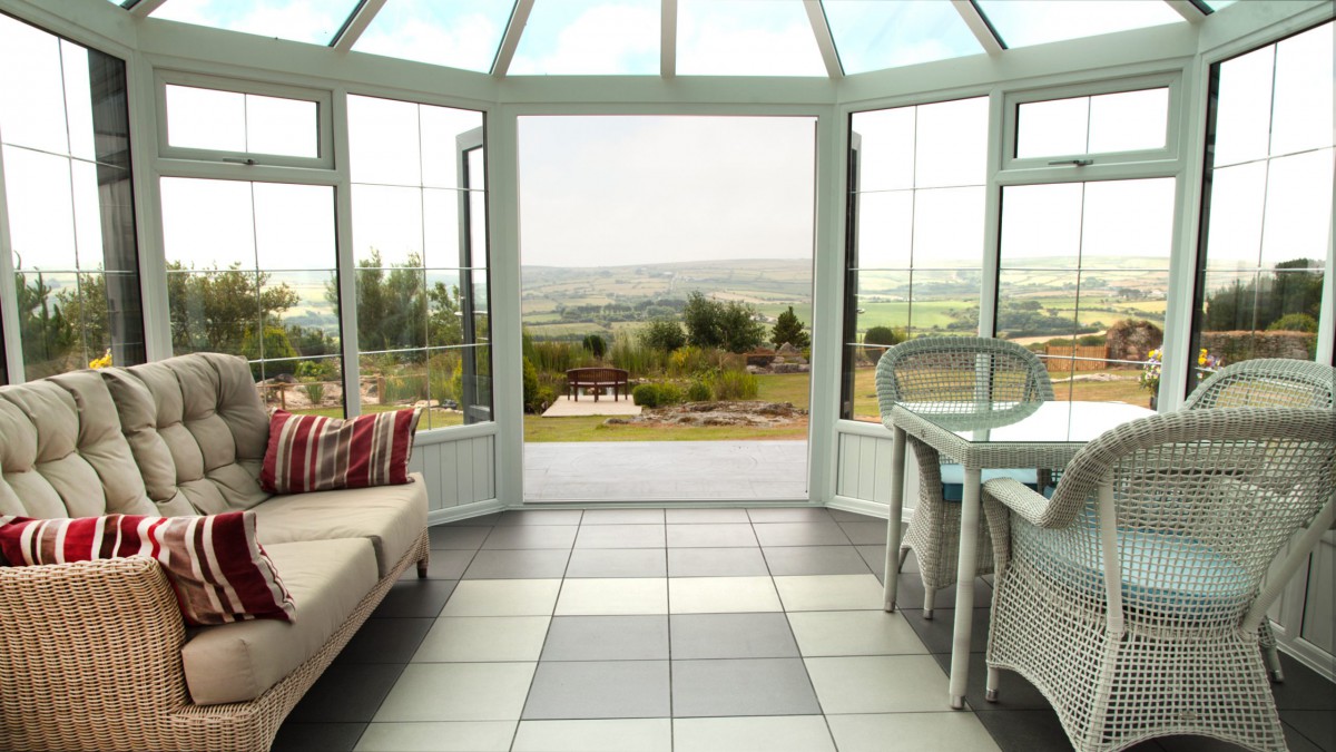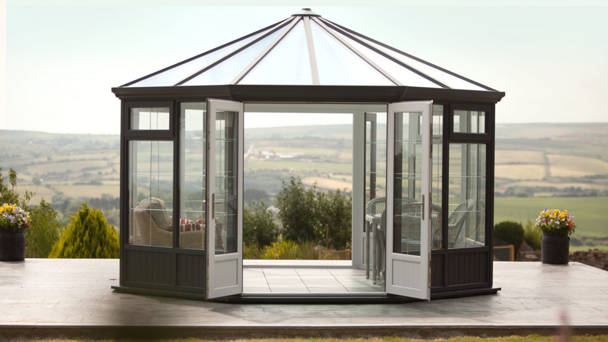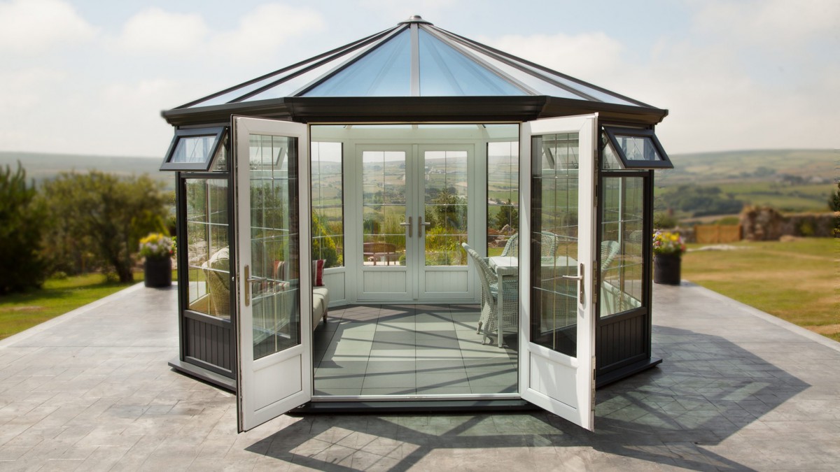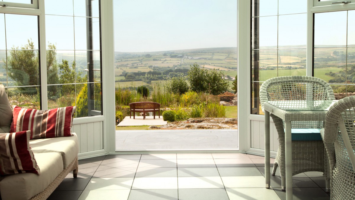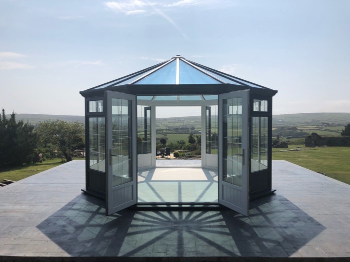 We can open both sets of twin doors set opposite one another on very warm days and it hasn’t got too hot, whereas when it’s windy or cooler we can close some, of all the doors, and regulate the temperature so we’re using it whatever the weather. As it’s big enough to house both a small dining table as well as casual seating, it’s suitable for a variety of uses.
